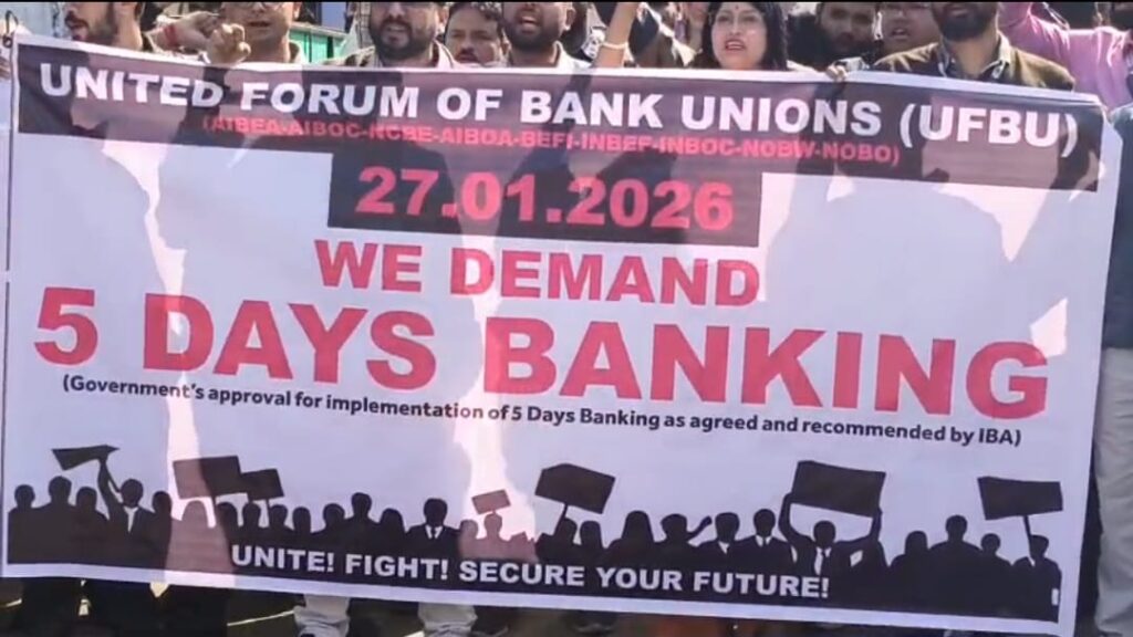 The protesters raised the slogan, “We Demand Five-Day Banking.”The agitating employees alleged that an understanding has already been reached with the Indian Banks’ Association (IBA) regarding the implementation of a five-day banking system, and recommendations have also been made for its execution. However, due to the absence of final approval from the Central Government, the decision has not yet been implemented. As a result, bank employees claimed they have been facing an increasing workload and mounting pressure for a long time.
