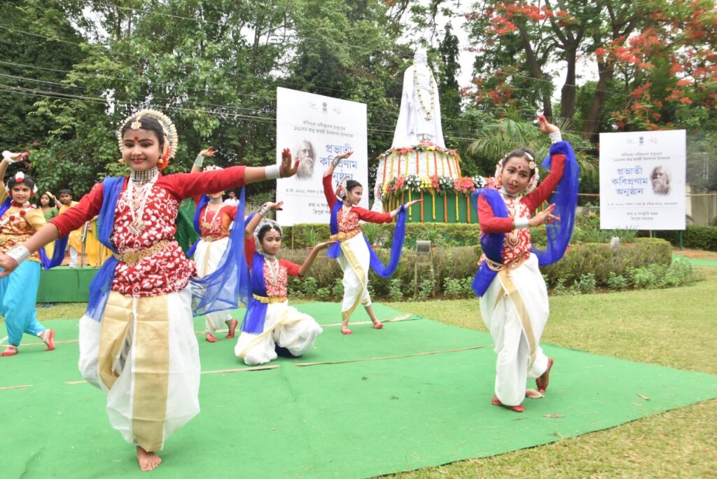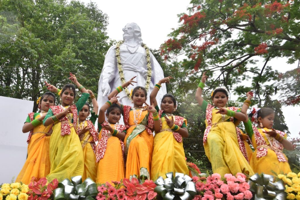 Students performed cultural programme during celebrations of Rabindranath Tagore’s 161st birth anniversary at Rabindra Kanan in Agartala on Monday (9th May, 2022).