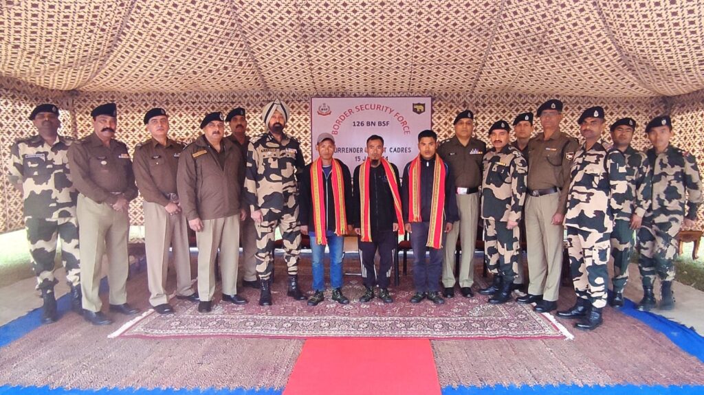 Agartala, 15th of January 2024 : On 15th Jan’ 2024, in the area of Border out post (BOP) Manoranjan under Chawmanu, Dhalai, three unlisted cadre of NLFT (BM) surrendered before BSF authorities. Today morning Mani Ranjan Tripura (28 yrs) @ Gondala S/o – Dahosa Tripura R/o- Rajendra Roaja Para, Ps- Manikpur, Distt-Dhalai, Chintajay Tripura(38yrs) S/o- Lt Dharma Jay Tripura, R/o – Bidhya kumar Roaja Para (Thalchera), Ps-Chawmanu, Distt- Dhalai and Raban Joy Tripura (28 yrs) S/o- Kemoni Tripura, R/o- Bidhya kumar Roaja Para (Thalchera) Ps-Chawmanu, Distt-Dhalai, decided to leave the path of violence and surrendered to live a normal life and to involve in the main stream of the nation. The surrendered insurgent Mani Ranjan Tripura joined NLFT (BM) outfit in the month of March 2023, Chintajay Tripura joined NLBT (BM) outfit in the month of April 2023 and Raban Joy Tripura jouinted NLFT(BM) outfit in the month of Dec 2023.