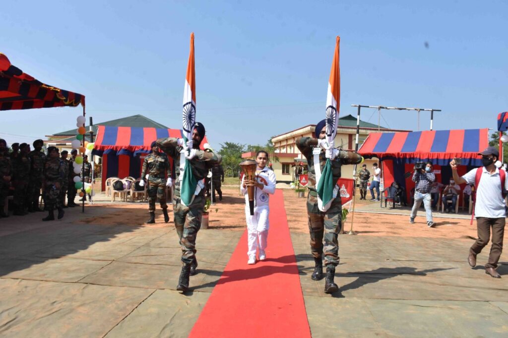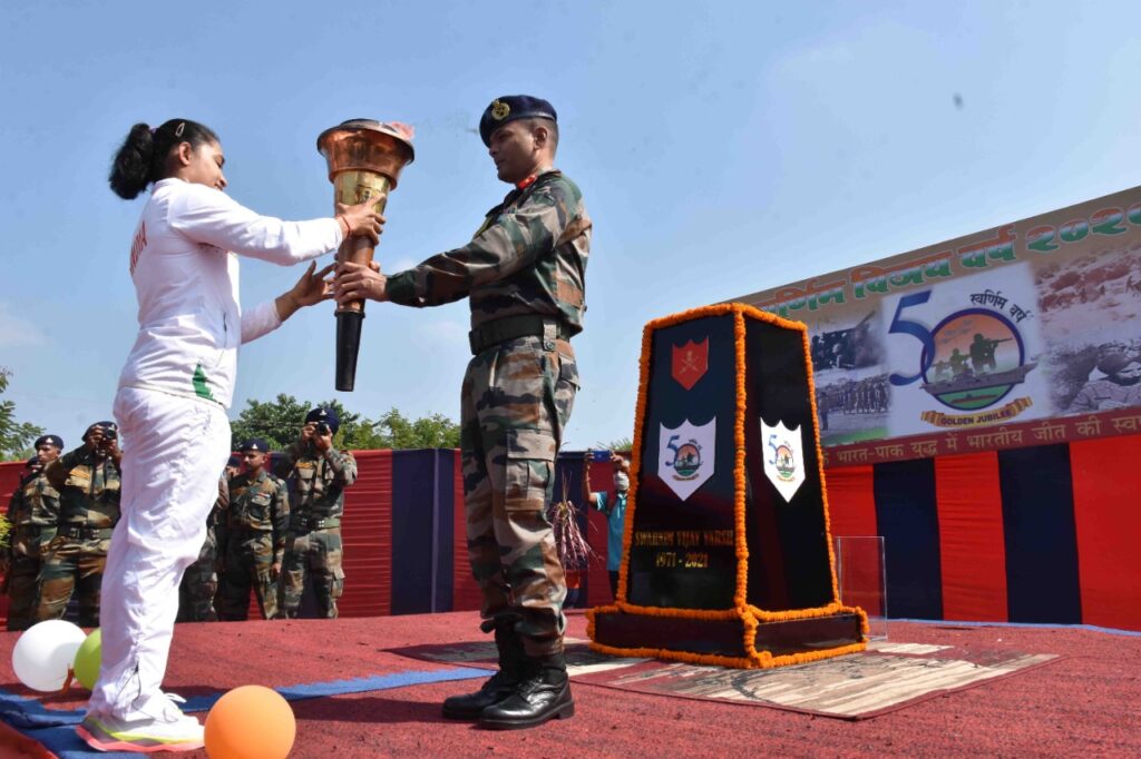 The “Swarnim Vijay Mashaal” (victory flame) to mark the golden jubilee of India’s success in liberating Bangladesh from Pakistan in 1971 has arrived on today (5th November, 2021) in Agartala. Gymnast Dipa Karmakar carried Swarnim Vijay Mashaal after it reaches Agartala. To commemorate the golden jubilee of Indian Armed Forces victory in 1971 Indo-Pak War, the Swarnim Vijay Mashaal was flagged off by Prime Minister Narendra Modi from National War Memorial in New Delhi on December 16, 2020. Four victory flames lit from the eternal flame at National War Memorial are being carried throughout the cities and villages across the nation including native places of Param Vir Chakra (PVC) and Maha Vir Chakra (MVC) awardees of 1971 war.