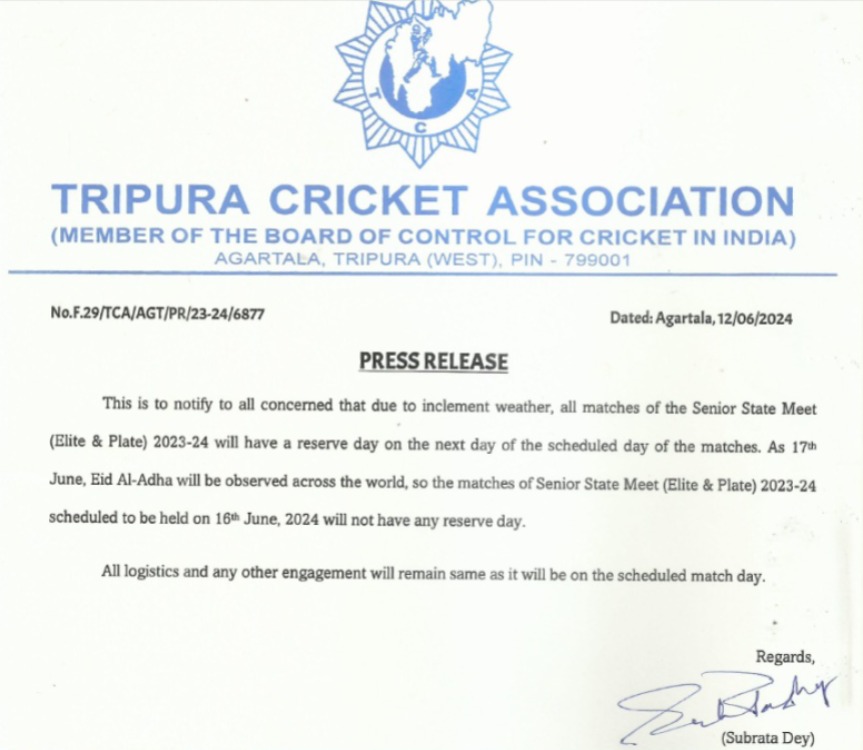 Agartala, 12th of June, 2024 : This is to notify to all concerned that due to inclement weather, all matches of the Senior State Meet (Elite & Plate) 2023-24 will have a reserve day on the next day of the scheduled day of the matches. As 17th June, Eid Al-Adha will be observed across the world, so the matches of Senior State Meet (Elite & Plate) 2023-24 scheduled to be held on 16th June, 2024 will not have any reserve day.