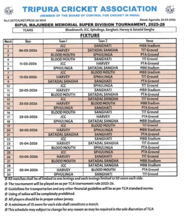 Agartala, Tripura, 26th of February, 2026 : Fixture Bipul Majumder Memorial Super Division.