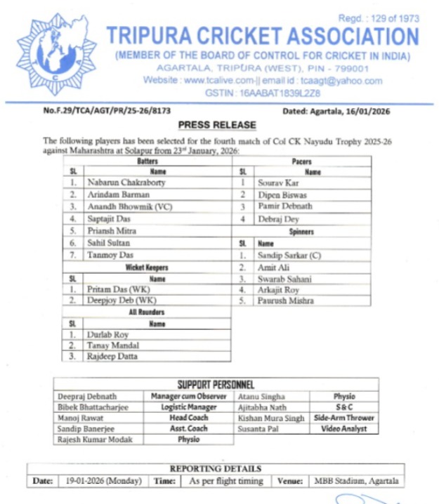 Agartala, Tripura, 16th of January, 2026 : Tripura Cricket Association published list of players has been selected for the fourth match of Col CK Nayudu Trophy 2025-26 against Maharashtra at Solapur from 23rd January, 2026.