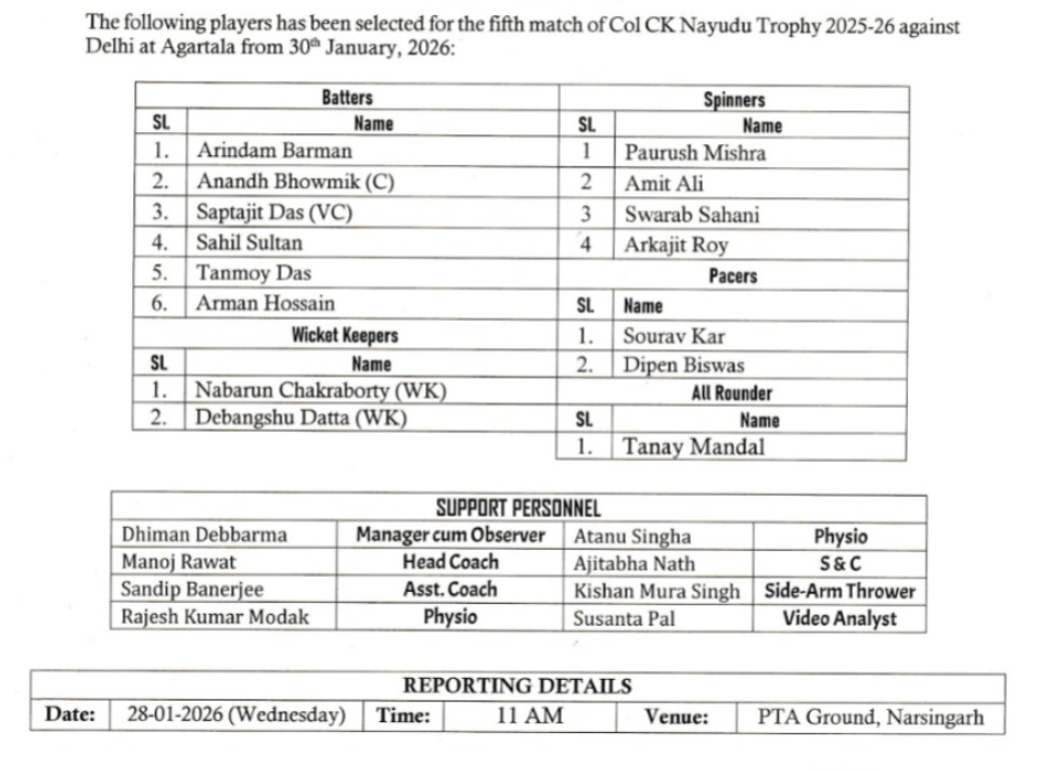 Agartala, Tripura, 27th of January, 2026 : Tripura Cricket Association published selected list of players for the fifth match of Col CK Nayudu Trophy 2025-26 against Delhi at Agartala from 30fr January, 2026.