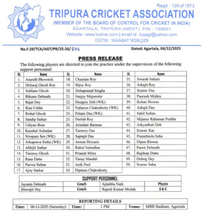 Agartala,Tripura, 4th of December, 2025 : The following players are directed to join the practice under the supervision of the following support personnel:
