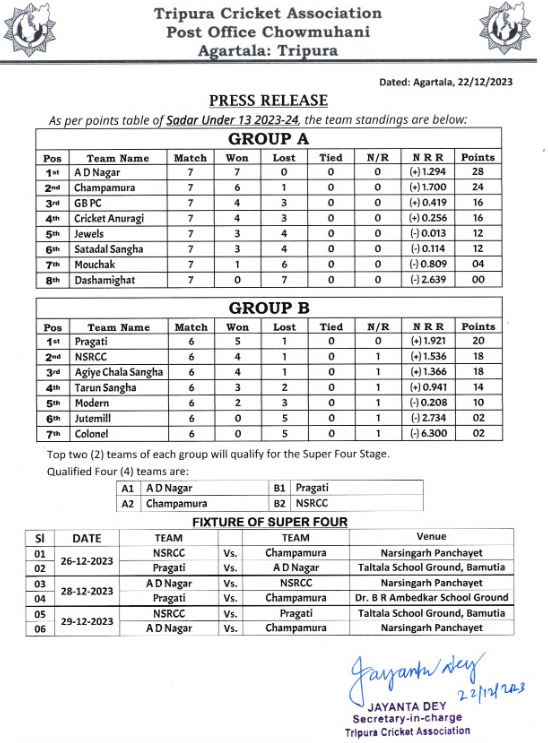 Agartala, 22nd of December 2023 : Tripura Cricket Association published points table of Sadar Under-13 2023-24, the team standings are below :