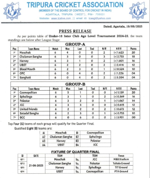 Agartala, Tripura, 19th of August, 2025 : Tripura Cricket Association (TCA) published Points Table of Under-18 Inter Club Age Level Tournament 2024-25.