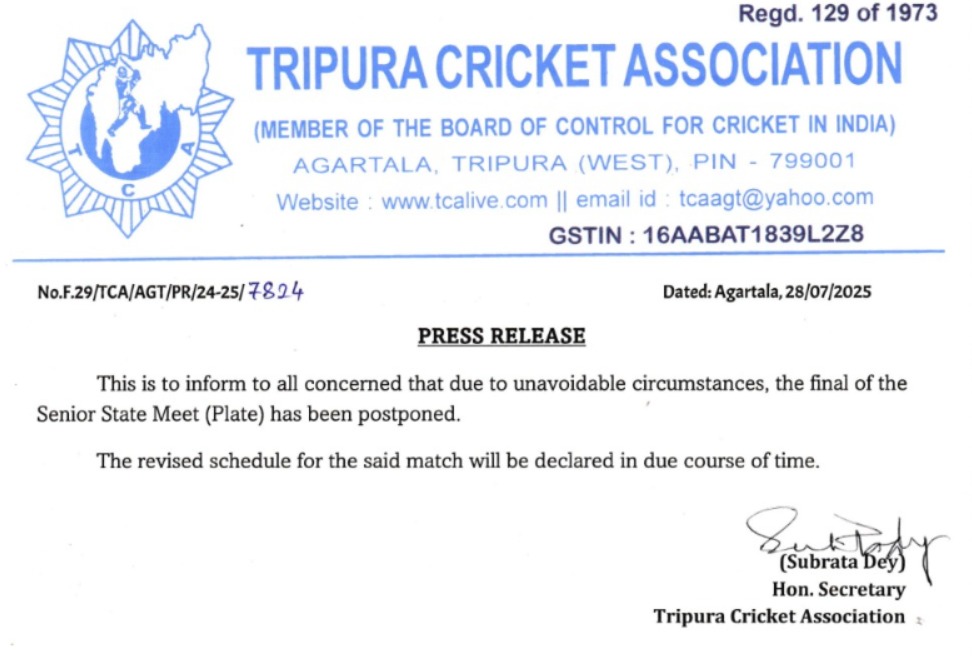 Agartala, Tripura, 28th of July 2025 : Tripura Cricket Association (TCA) statement – “This is to inform to all concerned that due to unavoidable circumstances, the final of the Senior State Meet (Plate) has been postponed. The revised schedule for the said match will be declared in due course of time.”