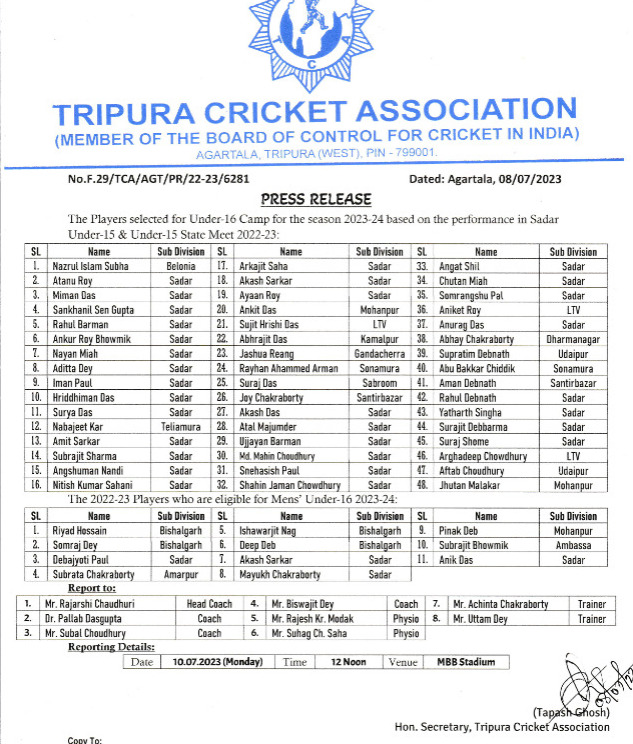 Tripura Cricket Association published list of the Players selected for Under-16 Camp for the season 2023-24 based on the performance in Sadar Under-l5 & Under-15 State Meet 2022-23