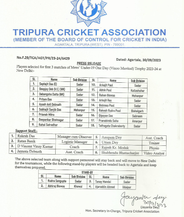 Tripura Cricket Association published selected players for first 3 matches of Mens’ Under-19 One Day (Vinoo Mankad) Trophy 2023-24 at New Delhi.
