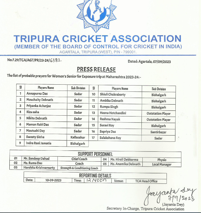 Tripura Cricket Association published the list of probable players for Womens’ Senior for exposure trip at Maharashtra 2023-24.