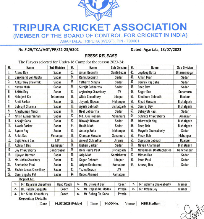 Tripura Cricket Association published the Players selected for Under-16 Camp for the season 2023-24