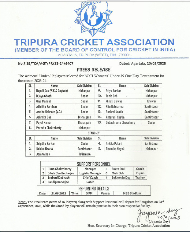 Tripura Cricket Association published Womens’ Under-19 Players selected for BCCI Womens’ Under-19 One Day Tournament for Season 2023-24.