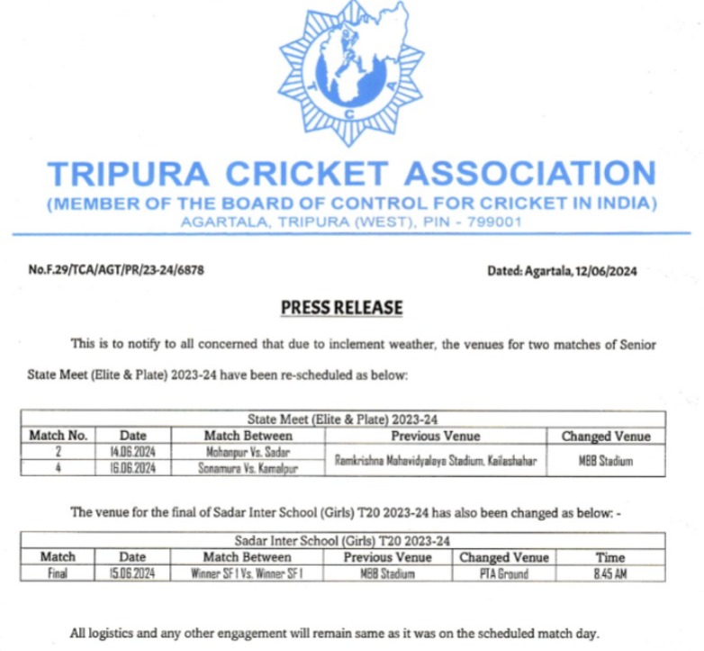 Agartala, 12th of June, 2024 : Tripura Cricket Association published Reschedule Of Venue Of Senior State Meet & Sadar Inter School (Girls) Final.