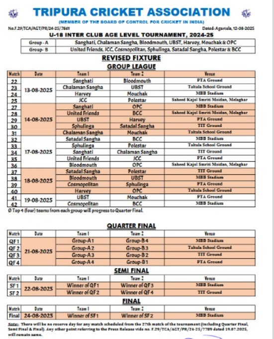 Agartala, Tripura, 12th of August, 2025 : Tripura Cricket Association (TCA) published Revised Fixture of U-18 Inter Club Age Level Tournament 2O24-25.