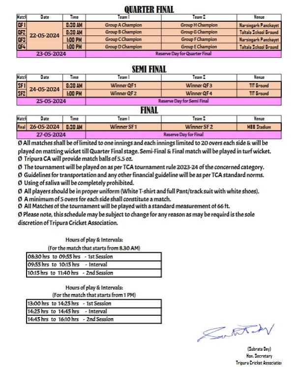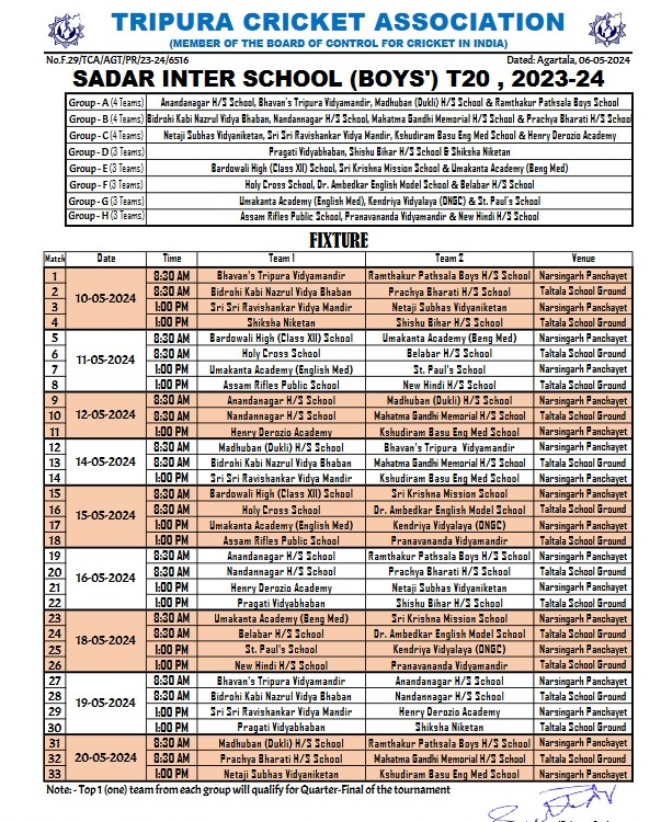 Agartala, 6th of May, 2024 : Tripura Cricket Association published Fixture of Sadar Inter School (Boys) T20 2023-24.