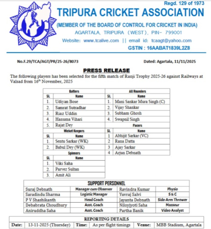 Agartala, Tripura, 11th of November, 2025 : Selected Players list for the Fifth Match of Ranji Trophy 2025-26 Against Railways At Valsad From 16th November, 2025.