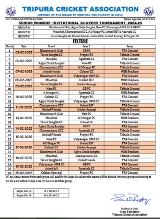 Agartala, Tripura, 30th of January, 2025 : Tripura Cricket Association (TCA) published Senior Womens’ Invitational 50 Overs Fixture.