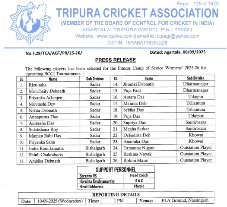 Agartala, Tripura, 6th of September 2025 : Tripura Cricket Association (TCA) published list of players has been selected for the Fitness Camp of Senior Womens’ 2025-26 for Upcoming BCCI Tournaments.
