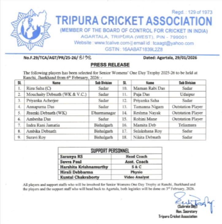 Agartala, Tripura, 1st of February, 2026 : Tripura Cricket Association published selected list of players for the Senior Womens Team One Day Trophy.