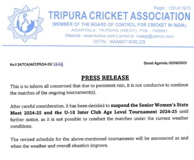 Agartala, Tripura, 5th of August, 2025 : Tripura Cricket Association (TCA) Statement – This is to inform all concerned that due to persistent rain, it is not conducive to continue the matches of the ongoing tournament(s). After careful consideration, it has been decided to suspend the Senior Women’s State Meet 2024-25 and the U-18 Inter Club Age Level Tournament 2024-25 until further notice, as it is not possible to conduct the matches under the current weather conditions. The revised schedule for the above-mentioned tournaments will be announced as and when the weather and overall situation improve.”