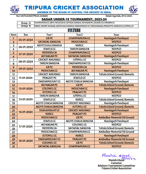 Agartala, 29th of December 2023 : Tripura Cricket Association published fixture of the Sadar Under-15 Tournament, 2023-24.