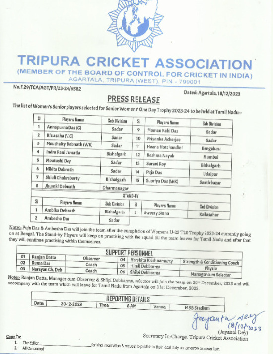 Agartala, 18th of December 2023 : Tripura Cricket Association published list of Senior Women’s Players selected for the Senior Women’s One Day Trophy 2023-24 to be held at Tamil Nadu.