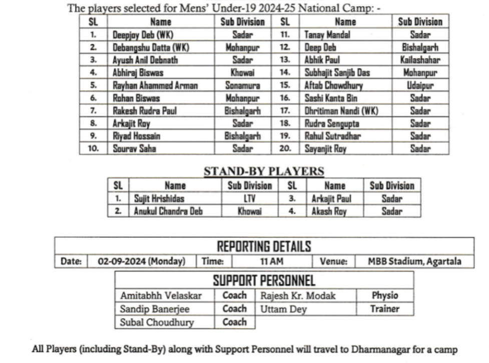 Agartala, Tripura, 30th of August, 2024 : Tripura Cricket Association published list of the Players Selected for Under-19 National camp At Dharmanagar.
