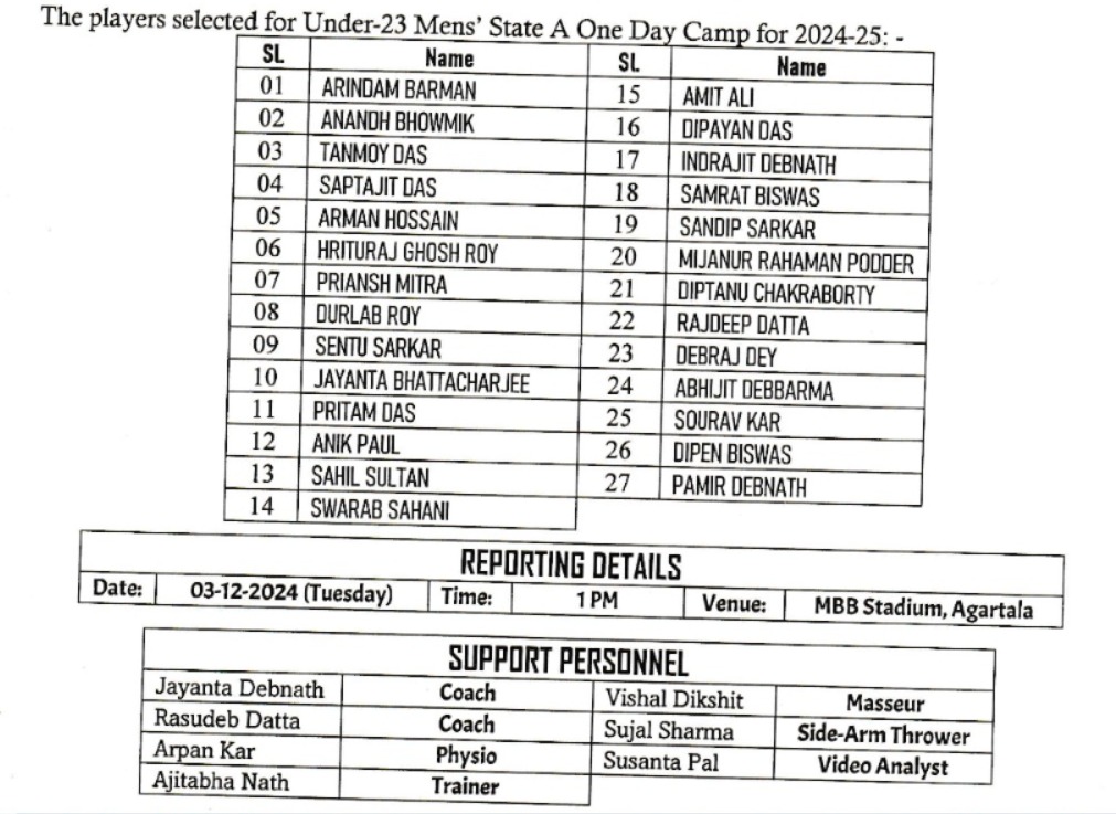 Agartala, Tripura, 2nd December, 2024 : Tripura Cricket Association (TCA) Published the Players List for the Mens’ Under 23 for One Day Camp For 2024-25.