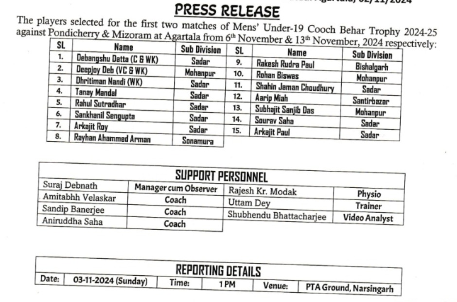 Agartala, Tripura, 2nd of November, 2024 : Tripura Cricket Association Published the Players list for the first Two Matches of Mens’ Under -19 Cooch Behar Trophy 2024-25 against Pondicherry & Mizoram at Agartala from 6th November & 13th November, 2024.