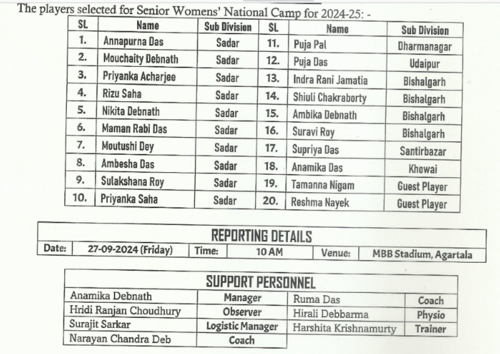 Agartala, Tripura, 25th of September, 2024 : Tripura Cricket Association published the Players Selected for Senior Womens’ National Camp for the season 2024-25.
