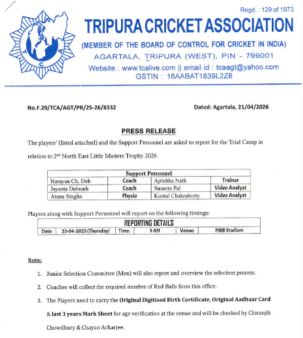 Details : Trail Camp For 2nd North East Little Masters Trophy 2025-26.