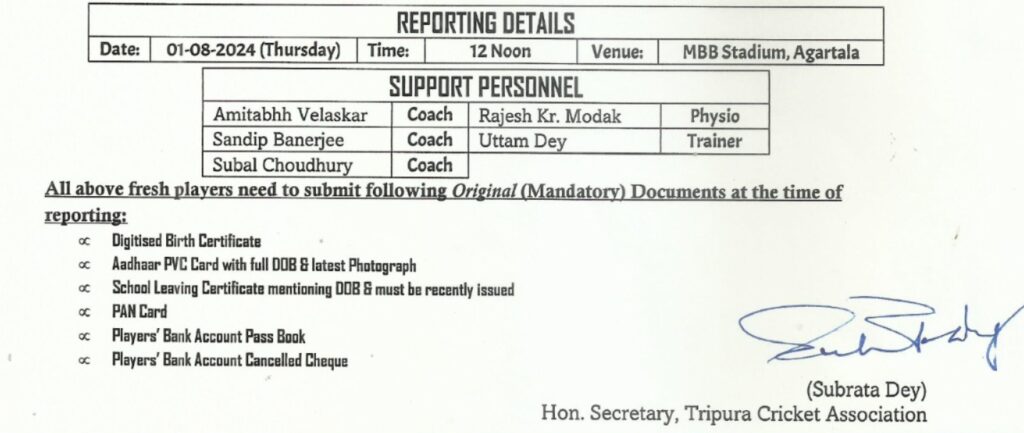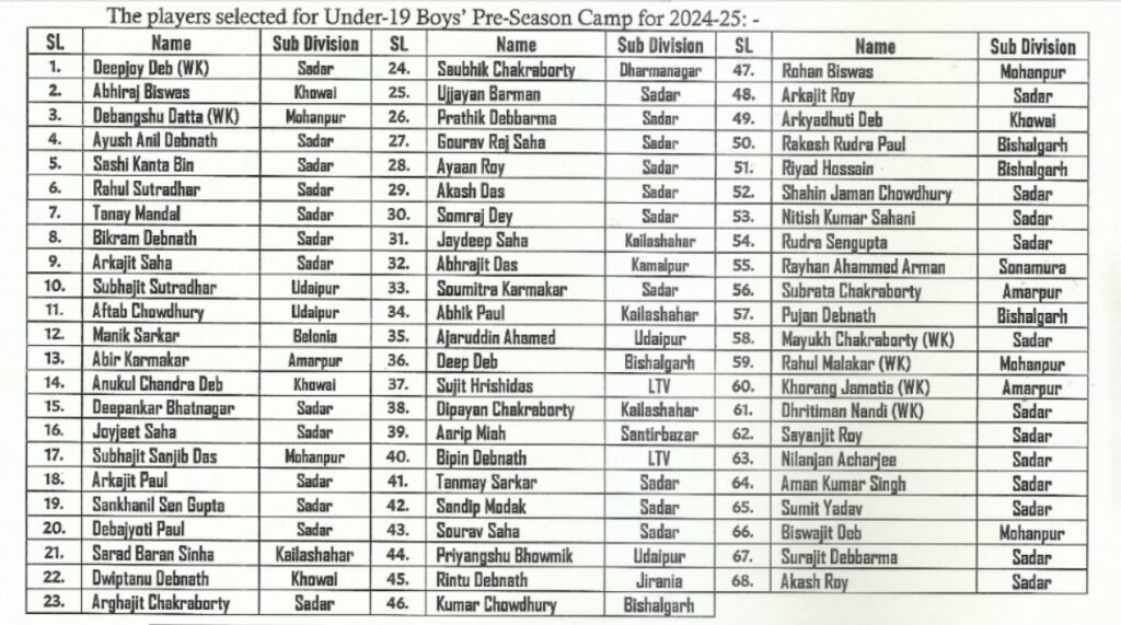 Agartala, 29th of July, 2024 : The Tripura Cricket Association (TCA) is announce the selected players for Mens’ Under-19 Pre-Season Camp for 2024-25.