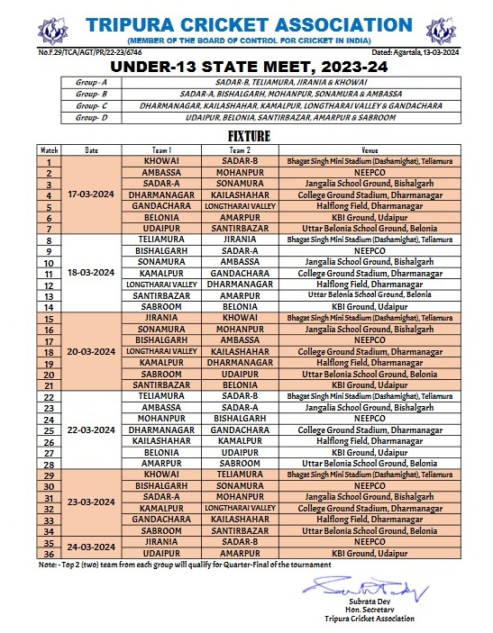 Agartala, 13th of March 2024 : Tripura Cricket Association published the Under 13 State Meet Fixture.