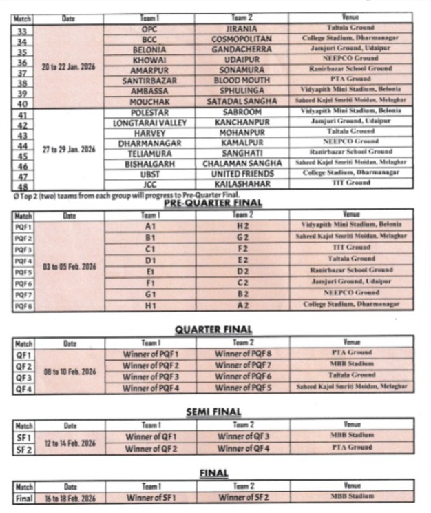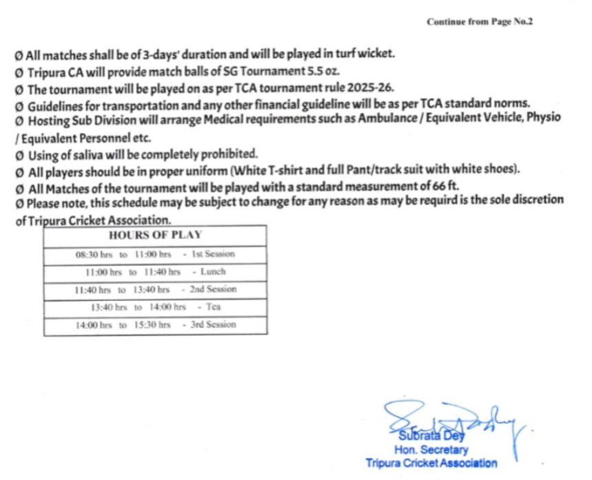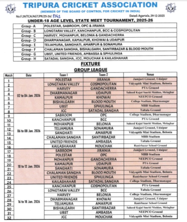 Agartala, Tripura, 29th of December, 2025 : Tripura Cricket Association (TCA) published fixture of U-18 Age Level State Meet Tournament 2025-26.