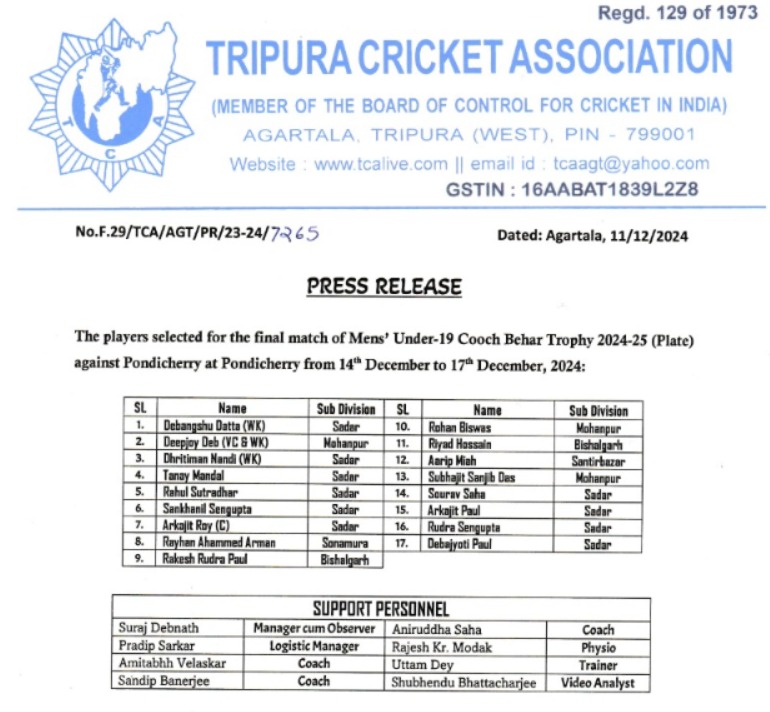 Agartala, Tripura, 11th of December, 2024 : Tripura Cricket Association (TCA) published the players list for the Final match Mens under 19 Cooch Behar Trophy against Pondicherry at Pondicherry from 14th December to 17th December, 2024.