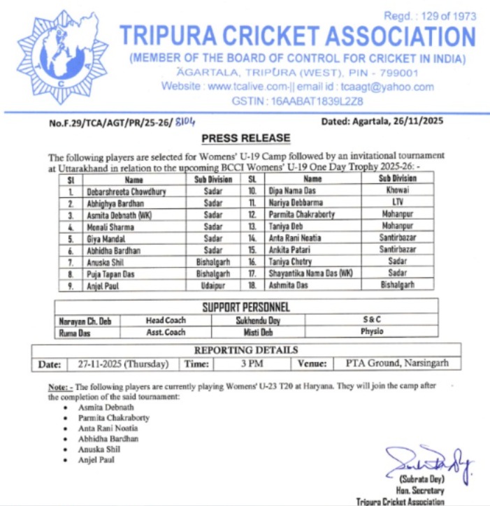 Agartala, Tripura, 27th of November, 2025 : Tripura Cricket Association (TCA) published Womens’ U-19 Camp & Invitational Tournament Team 2025-26
