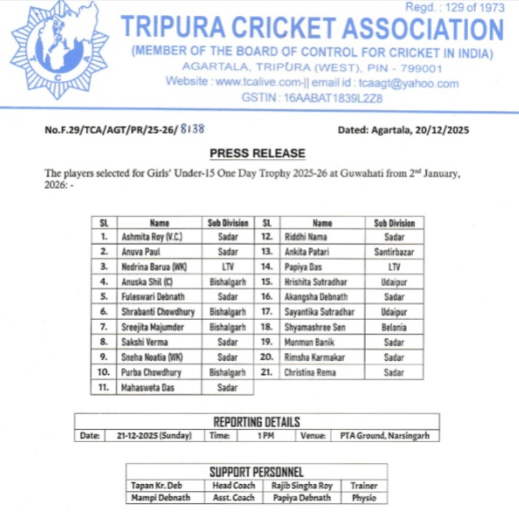 Agartala, Tripura, 20th of December 2025 : Tripura Cricket Association (TCA) published list of the Womens U15 Team For One Day Trophy 2025-26.
