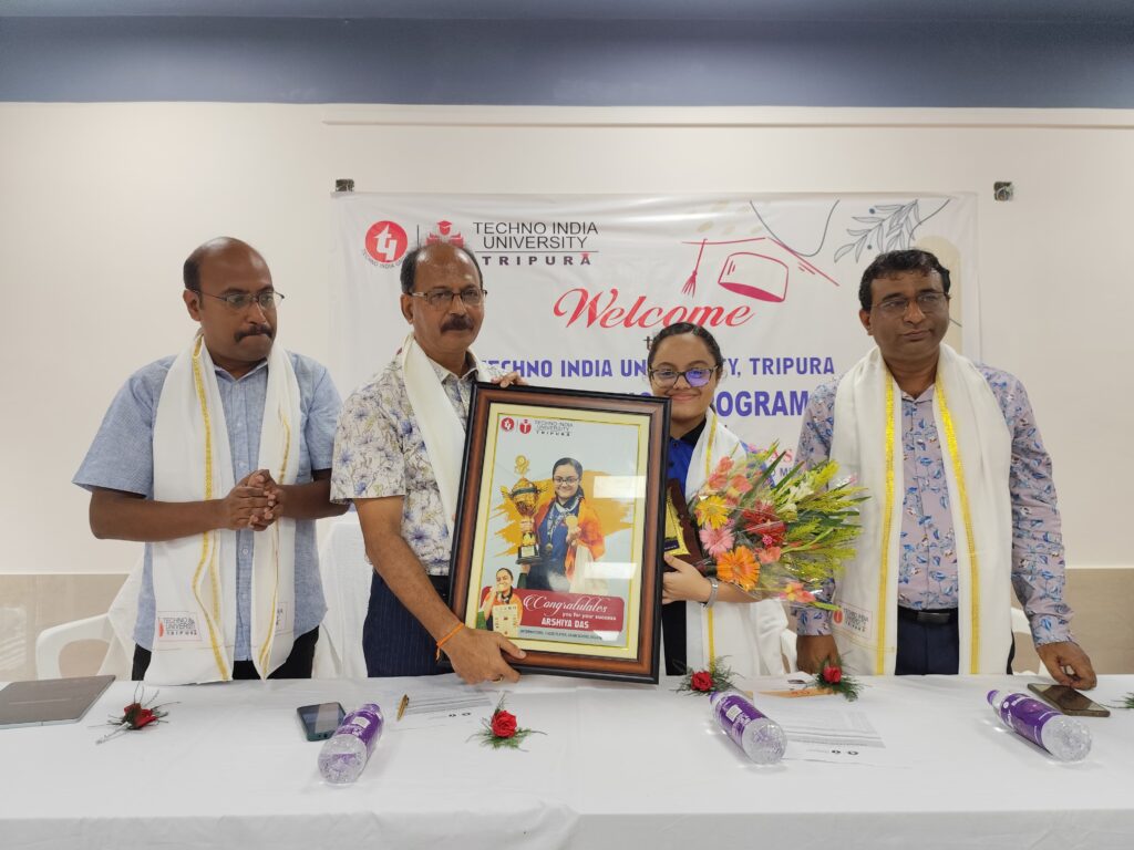 As part of the orientation for the new batch of learners, a reception ceremony was organized to honor Ms. Das, where she was felicitated with a bouquet, a memento, and a portrait. Her parents were also honored. Ms. Das presented a chessboard to the Vice-Chancellor to promote chess. Dr. Dibakar Deb, Principal of Techno India Engineering College also felicitated Ms. Das. The Vice-Chancellor assured that Techno India Group would support her future endeavors and higher education pursuits at the university. The event, held at the Maheshkhola campus, included a welcome session for new students and an interaction with their parents, attended by the Hon’ble Vice-Chancellor, the respected Principal, and other faculty members.