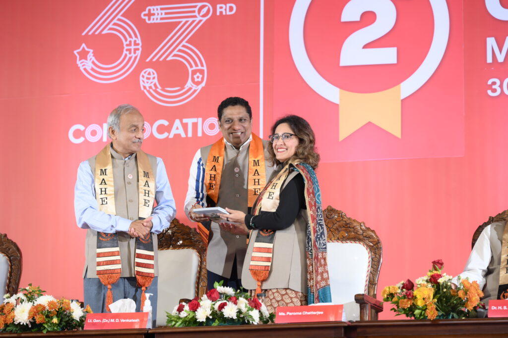 The ceremony began with Pro Chancellor, MAHE Dr. H. S. Ballal declaring the convocation open followed by an impactful welcome address by Dr. Madhu Veeraraghavan, Pro Vice Chancellor – MLHS and MAHE Bengaluru. For centuries, we competed on speed, scale, and efficiency, but today machines handle tasks once valued for human effort. The true edge lies in slowness, mastery, depth, and presence. This is reflected in the Japanese concept of Takumi, the master craftsman who dedicates a lifetime to perfecting a single skill. Like the Takumi, focus on becoming exceptional at a few things. In a world obsessed with speed, your deliberate, thoughtful work makes you irreplaceable.