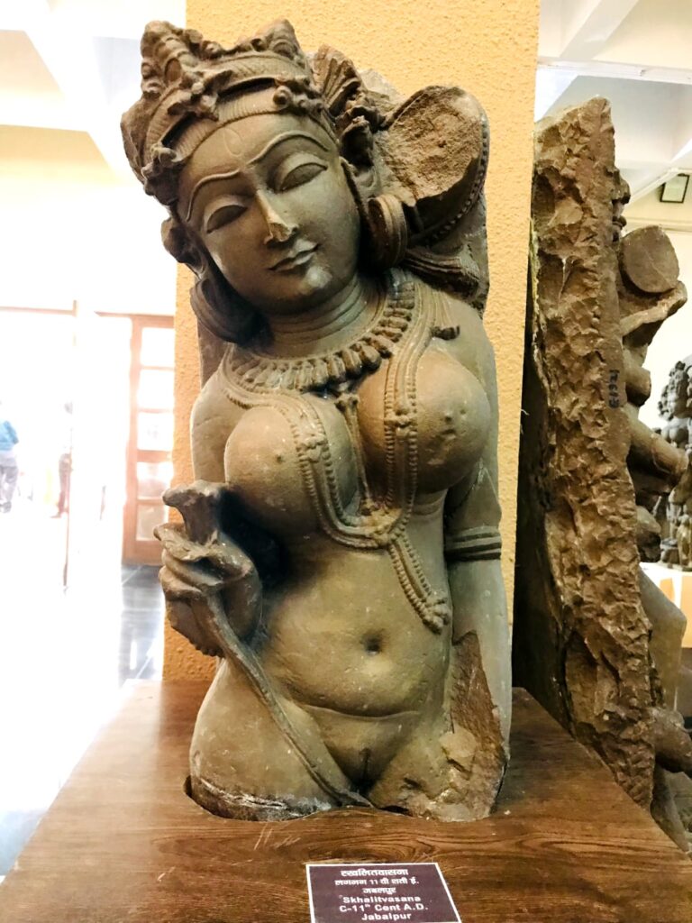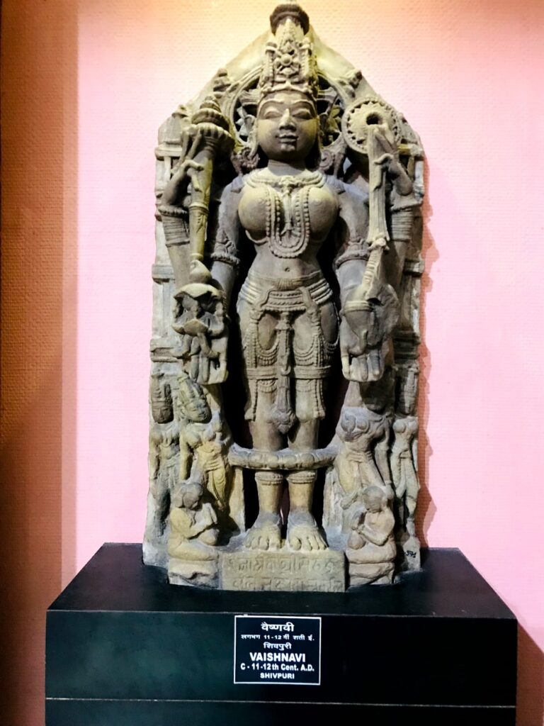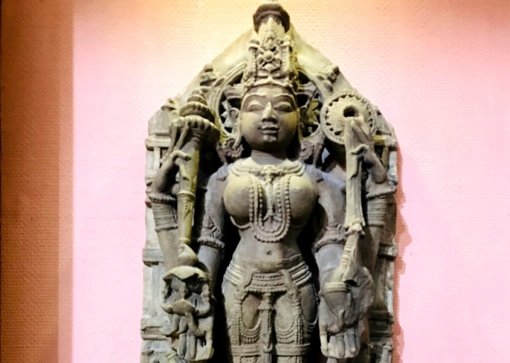 The Vaishnavi sculpture from the 11th–12th century reflects strong regional stylistic influences. Depicted in a standing posture, the goddess holds symbolic attributes such as the conch, discus, mace, and lotus. She is richly adorned with a crown, earrings, layered necklaces, waist girdle, Vaijayanti garland, anklets, bangles, and armlets. At the base, an attendant figure is shown receiving her blessings, adding a devotional dimension to the composition. The sculpture exemplifies how jewellery was integral not only to aesthetics but also to divine iconography.