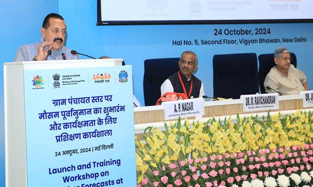 New Delhi, Delhi, 24th of October, 2024 : In a significant move to enhance agricultural productivity, Union Minister of State (Independent Charge) for Science and Technology, Minister of State (Independent Charge) for Earth Sciences, MoS PMO, Department of Atomic Energy, Department of Space, Personnel, Public Grievances and Pensions Dr. Jitendra Singh today addressed the launch and training workshop on weather forecast initiative aimed at Gram Panchayats across India. Addressing a training workshop, he emphasized the importance of providing timely and localized weather information to nearly 2.6 lakh panchayats, thereby directly supporting the nation’s farmers.