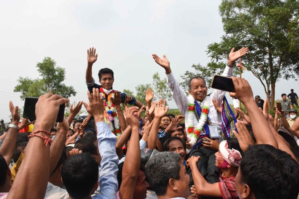 TIPRA MOTHA Candidate Rabindra Debbarma & Runeil Debbarma celebrates his victory in the TTAADC at Bodhjungnagar Wakinagar (ST) Constituency in Agartala on 10th April 2021