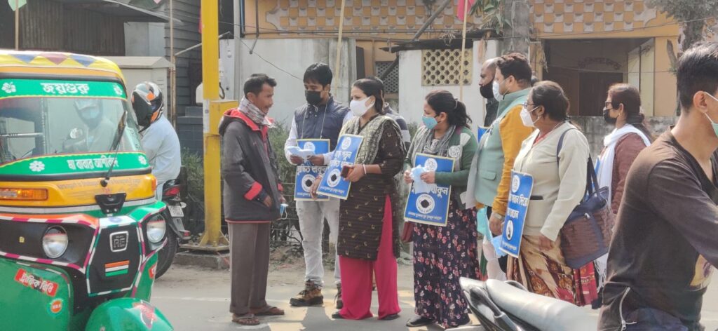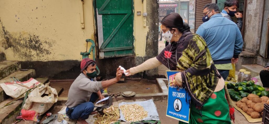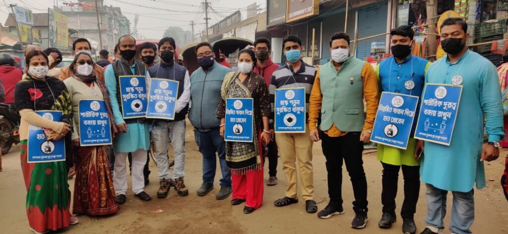 Trinamool Congress (TMC) supporters distributed masks and sanitizers to people at Lake Chowmuhani Market, Agartala on Wednesday (19th January, 2022).