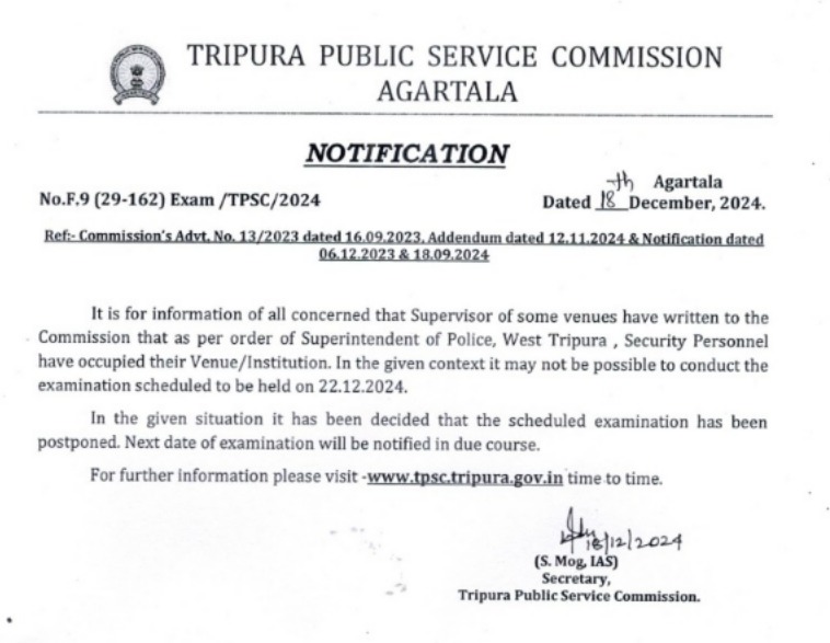 Agartala, Tripura, 19th of December, 2024 : Notification regarding postponed of Preliminary Examination for Recruitment to Miscellaneous posts.