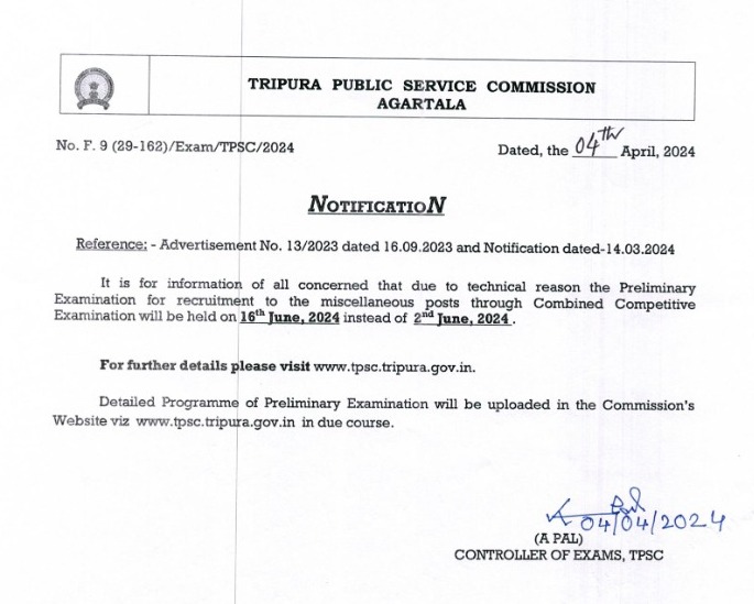 Agartala, 4th April, 2024 : It is for information of all concerned that the Preliminary Examination for recruitment to the miscellaneous posts through Tripura Combined Competitive Examination will be held on 16th June, 2024 instead of 2nd June, 2024.