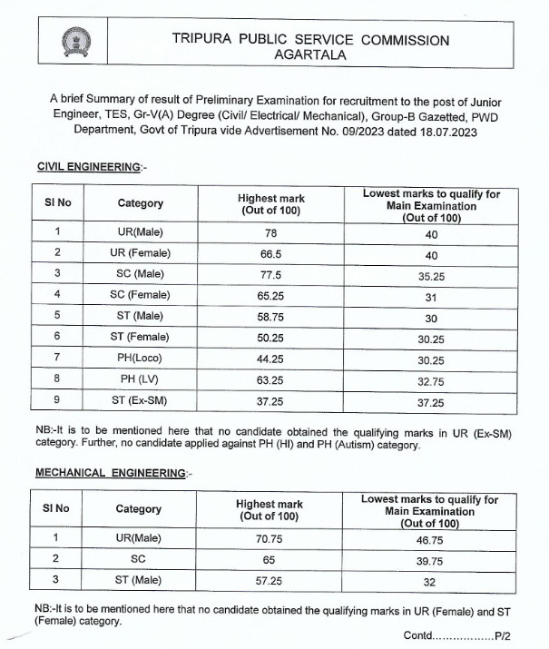 Agartala, 19th of January 2024 : Tripura Public Service Commission published Summary of result of Preliminary Examination for recruitment to the post of Junior Engineer, TES, Gr-V(A) Degree (Civil/ Electrical/ Mechanical), Group-B Gazetted, PWD Department, Govt of Tripura vide Advertisement No. 09/2023 dated 18.07.2023