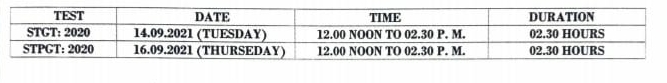 This is for information to all concerned that in pursuance to notification no.F. 2 (1-18)/GEN/TRBT/REC/2020/120 dated: 23.04.2021, the dates of Selection Tests for Graduate Teacher (STGT) : 2020 and Selection Tests for Post Graduate Teacher (STPGT) : 2020 have been Re-Scheduled as under :