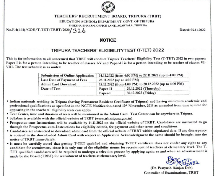 Teachers’ Recruitment Board, Tripura (TRBT) Announced Tripura Teachers’ Eligibility Test (T-TET) 2022, TET-I & TET-II Examination 2022 will be held on 30th and 29th December 2022.