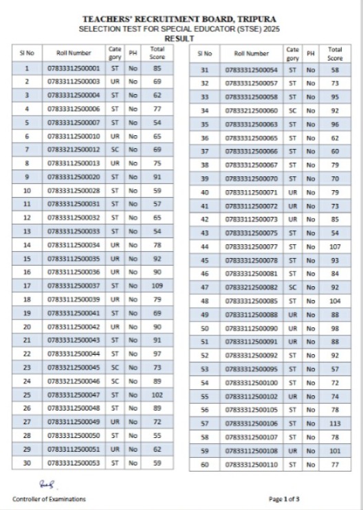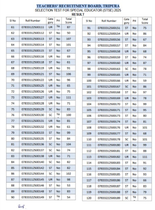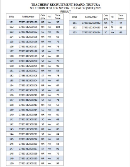 Agartala, Tripura, 19th of August, 2025 : Teachers’ Recruitment Board, Tripura (TRBT) published the results of Selection Test For Special Educator (STSE).